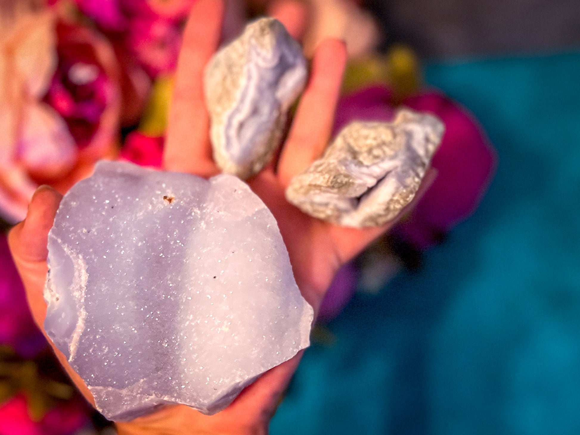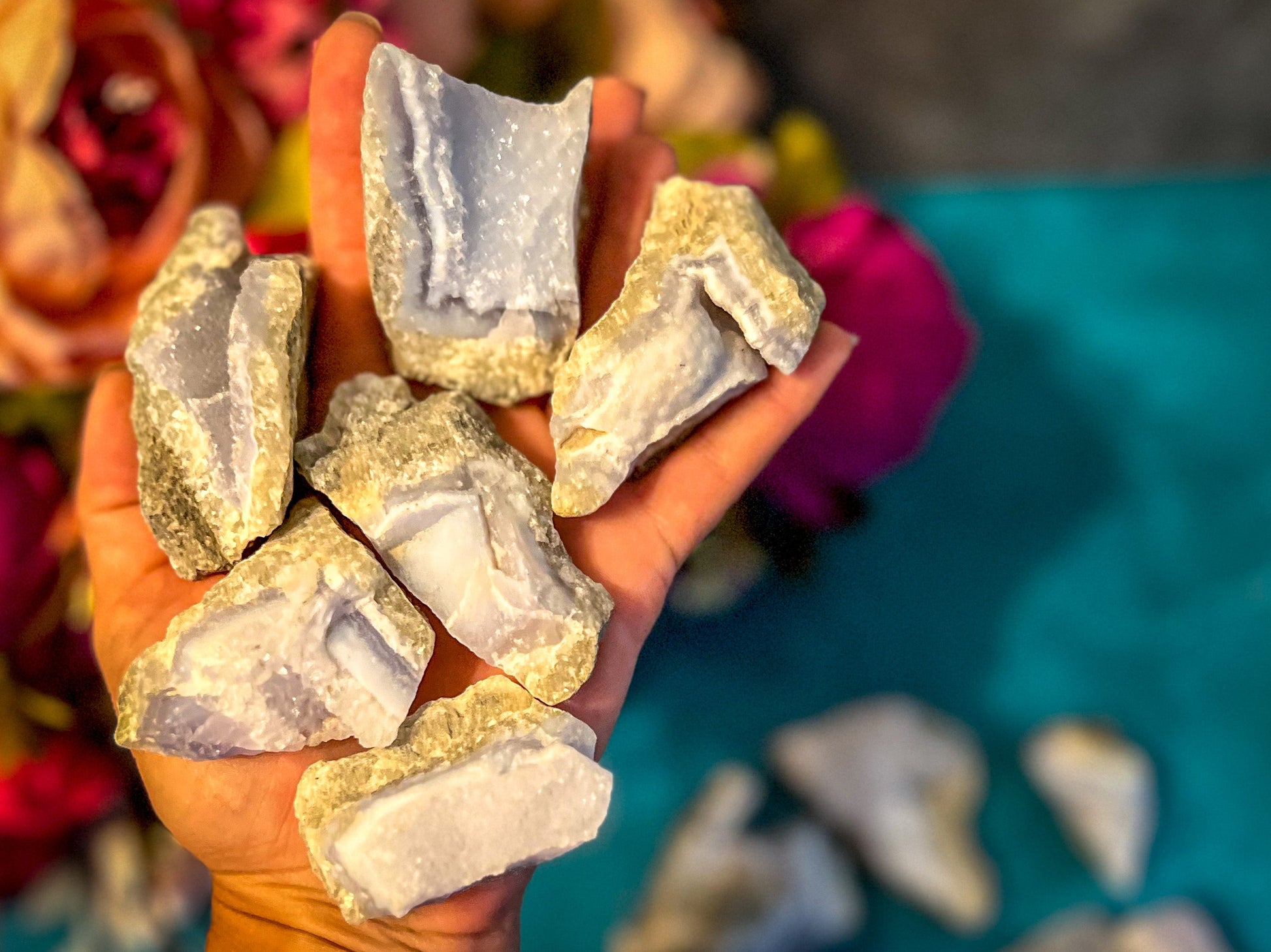 Check out these Raw Blue Lace Agate Crystals! This listing is for 1 Lb (450 grams) of a mixed selection of these. Each photo shows a representation of what one of these groups may look like.