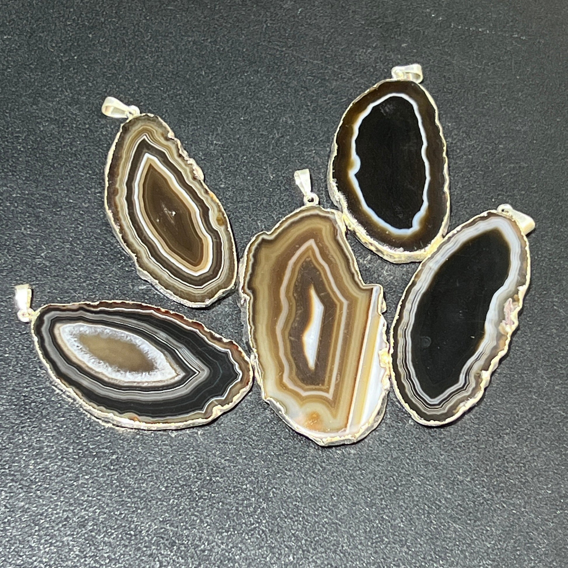Agate Slice Pendants (Black / Brown)(Silver Edges) Wholesale