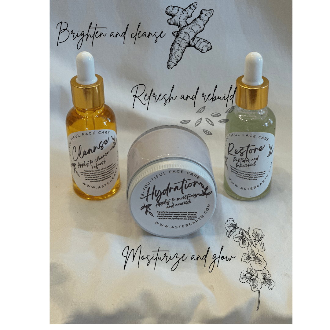 This kit combines our Facial Cleansing oil, Restorative Serum, and our Hydrating face lotion all In one!